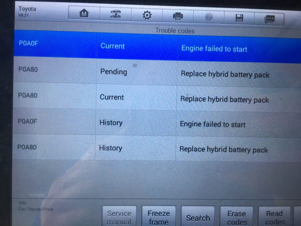 A 2011 Toyota Prius was presented to us recently with the message: Check Hybrid System on the dash. A scan revealed the fault code P0A80 – Replace hybrid battery pack.